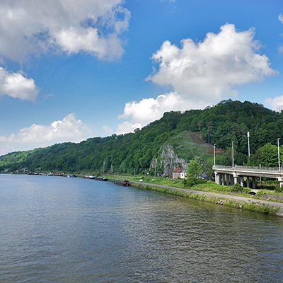 Nous traversons la Meuse lorsque le soleil crée une belle lumière sur la rive du fleuve.