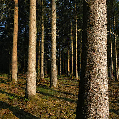 The evening sun conjures up a picturesque light and lets the rays of the sun dance through the tree trunks.