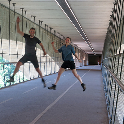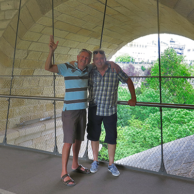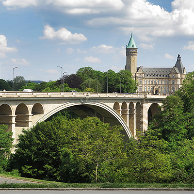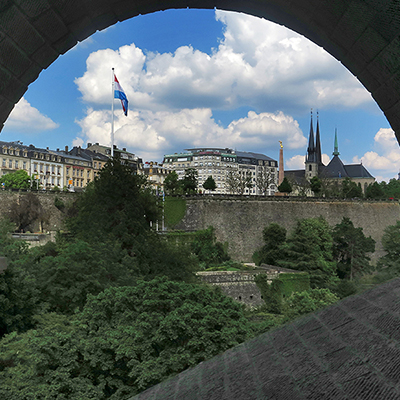 Im Stadtzentrum sticht uns die über hundert Jahre alte Steinbogenbrücke ins Auge: Die Adolphe-Brücke führt über das Petruss-Tal mit dem gleichnamigen kleinen Flüsschen und bietet einen malerischen Blick auf die Stadt. Unter der Autobefahrenen Straße befindet sich im Inneren der Brücke ein Fußgänger- und Fahrradweg. Bei der Suche nach dem idealen Aussichtspunkt treffen wir auf zwei nette Herren, die uns den perfekten Ausblick verraten (vielen Dank :-)). Und sie haben Recht: Zwischen einem der Steinbögen führt der Blick auf die Kriegsdenkmal-Statue „Gëlle Fra“ (deutsch: Goldene Frau) und die dahinterliegende Notre-Dame Kathedrale mit ihren auffallend spitzen Türmen. Unten liegt das schöne Petruss-Tal mit wunderschönen alten Bäumen. In the city center, the stone arch bridge, which is more than a hundred years old, catches our eye: The Adolphe Bridge leads over the Pétrusse Valley with the small river of the same name and offers a picturesque view of the city. Inside the bridge there is a pedestrian and bicycle path under the car-driven road. When looking for the ideal vantage point, we met two nice gentlemen who gave us the perfect view (thank you very much :-)). And they are right: between one of the stone arches you can see the war memorial statue “Gëlle Fra” (English: Golden Lady) and the Notre-Dame Cathedral behind it with its strikingly pointed towers. Below is the Pétrusse valley with beautiful old trees. Au centre-ville, le pont en arc de pierre, plus que centenaire, attire notre attention: le Pont Adolphe traverse la vallée du Pétrusse avec la petite rivière du même nom et offre une vue pittoresque sur la ville. À l'intérieur du pont, il y a une piste piétonne et cyclable sous la route carrossée. En cherchant le point de vue idéal, nous avons rencontré deux gentils messieurs qui nous ont donné la vue parfaite (merci beaucoup :-)). Et les hommes ont raison: entre l'une des arches de pierre, vous pouvez voir la statue commémorative de guerre « Gëlle Fra » (français: femme en or) et la cathédrale Notre-Dame derrière elle avec ses tours remarquablement pointues. Ci-dessous se trouve la belle vallée de Pétrusse avec de beaux arbres centenaires.