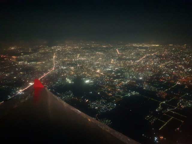 We took a photo in front of the city sign, chatted for a while with the man who had kindly photographed us, and started the last 25km through the mega-city towards the airport.