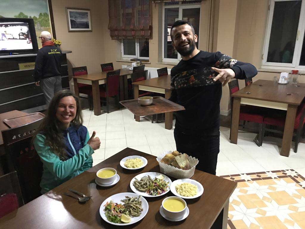 Nous avons pris notre goûter le midi dans un petit restaurant à l'entrée du village. Deux coqs se battaient devant l'entrée, des poules couraient partout. Il y avait quelques tables et bancs à l'extérieur où nous étions heureusement assis. À l'intérieur, il y avait une grande chaleur provenant de la cheminée au milieu. Le propriétaire nous a accueillis chaleureusement et a insisté pour que nous nous asseyions à côté du poêle car il faisait tellement froid. Nous n'avions pas le droit de nous disputer, alors nous nous sommes assis à table. Nous voulions juste manger du fromage, des saucisses et du kofta, mais on nous a servi une énorme montagne de nourriture. En commençant par les tranches de pain, ajouter le beurre et le miel. Le propriétaire m'a donné les pinces à pain et m'a montré les miches de pain sur la cheminée pour que je garde un œil dessus. À côté du cay classique, nous nous sommes glissés dans l'énorme montagne de nourriture que ses deux cousins et sa femme ont préparée en un rien de temps pendant qu'il discutait avec nous. C'était incroyablement délicieux, mais beaucoup trop pour nous. Lorsque les estomacs étaient pleins à ras bord, nous avons pris nos boîtes de collations et avons emporté le reste avec nous. J'ai aussi bu mon premier café turc - délicieux !!